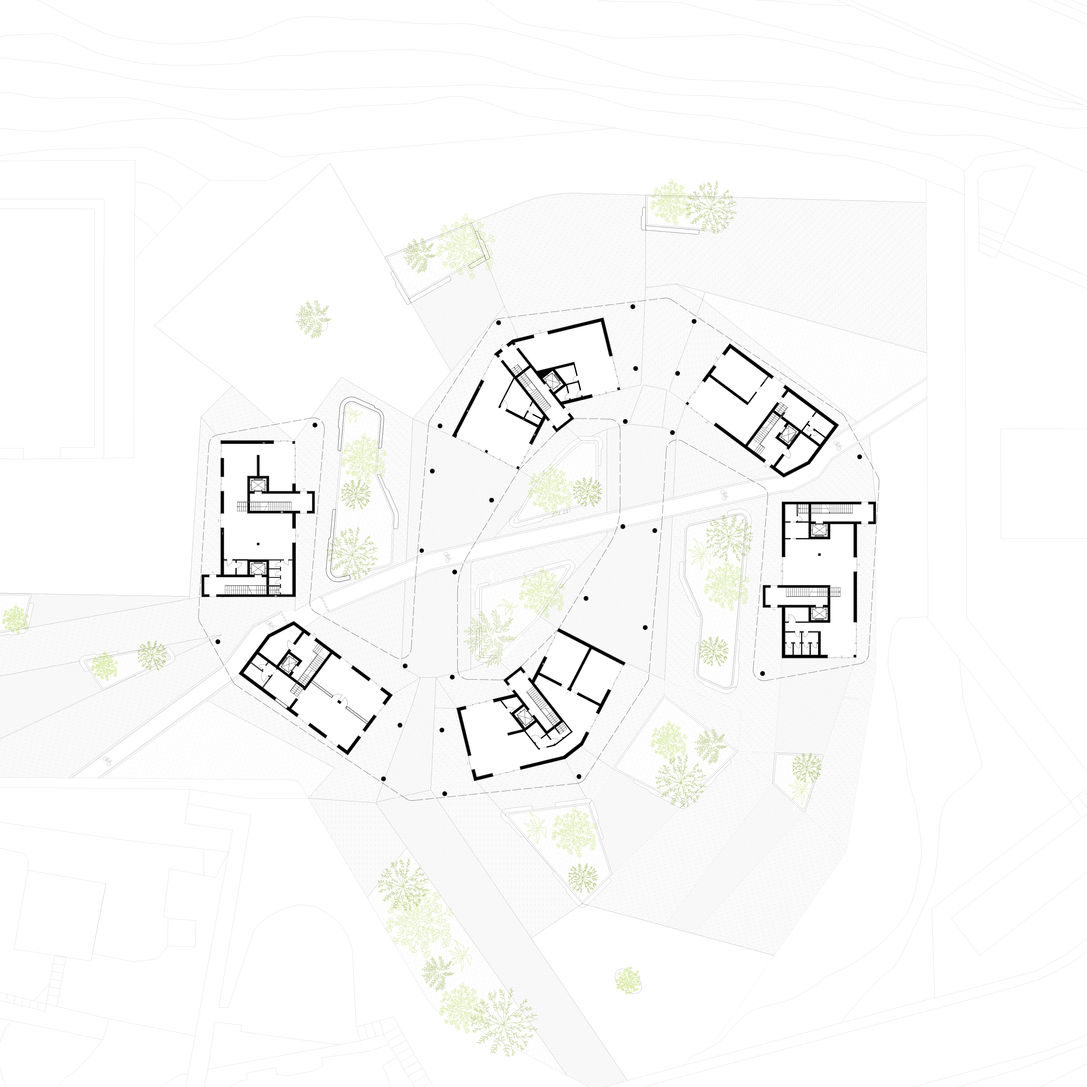 Per fornire di maggiori spazi verdi le abitazioni è stato progettato un piano sopraelevato esterno che, oltre ad ospitare giardini, connette gli edifici.