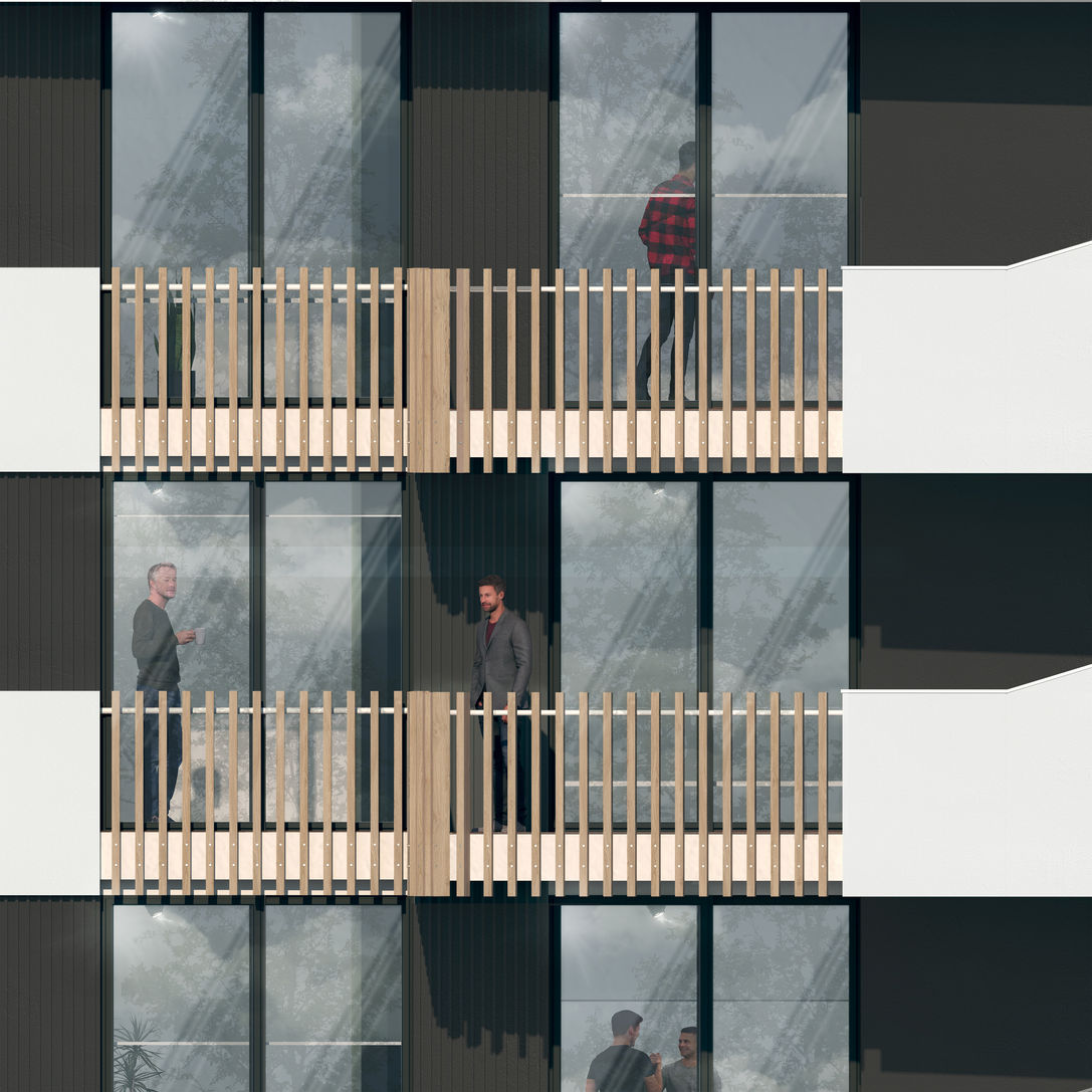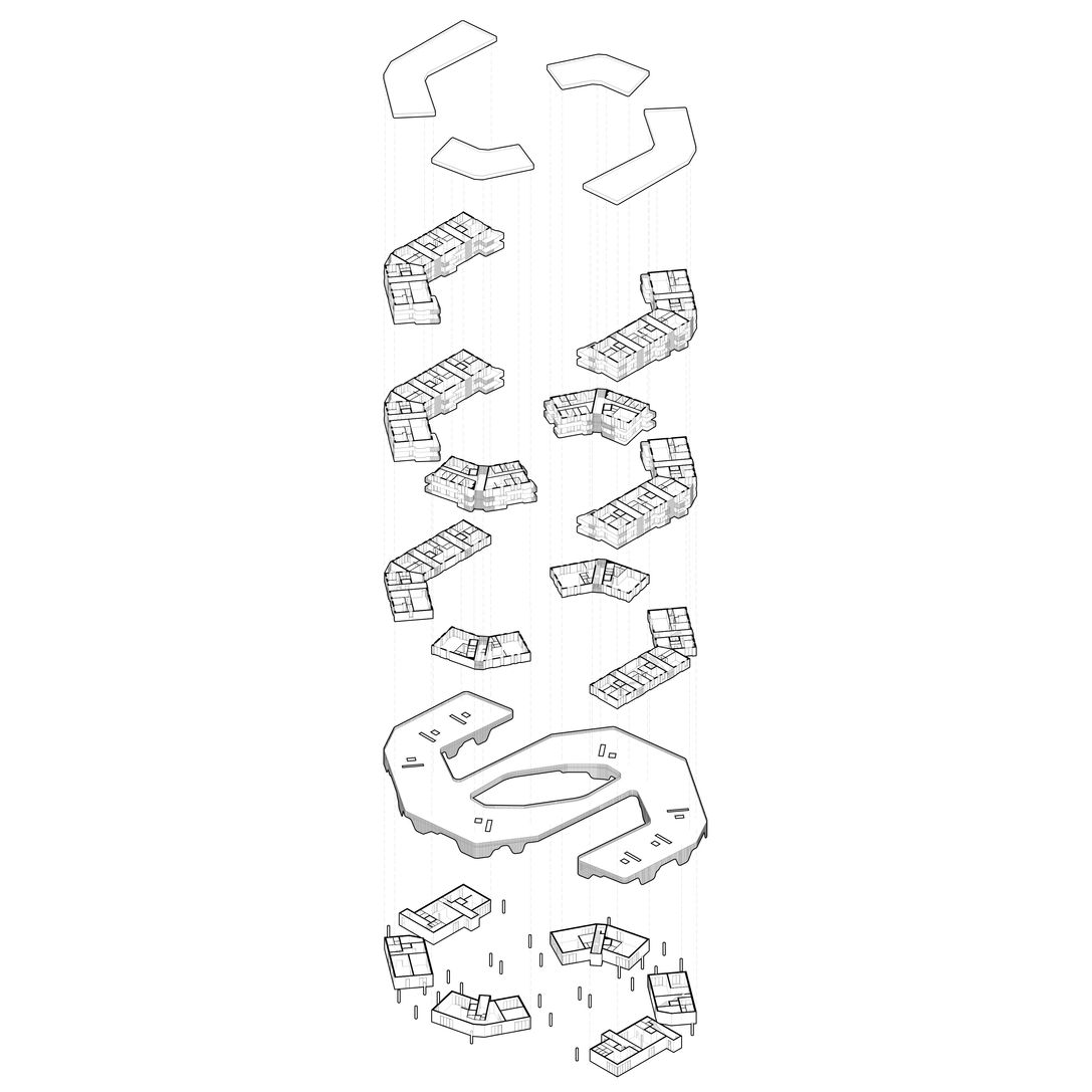 ottenendo quindi quattro differenti volumi, due per destinazione d'uso e con differenti altezze.