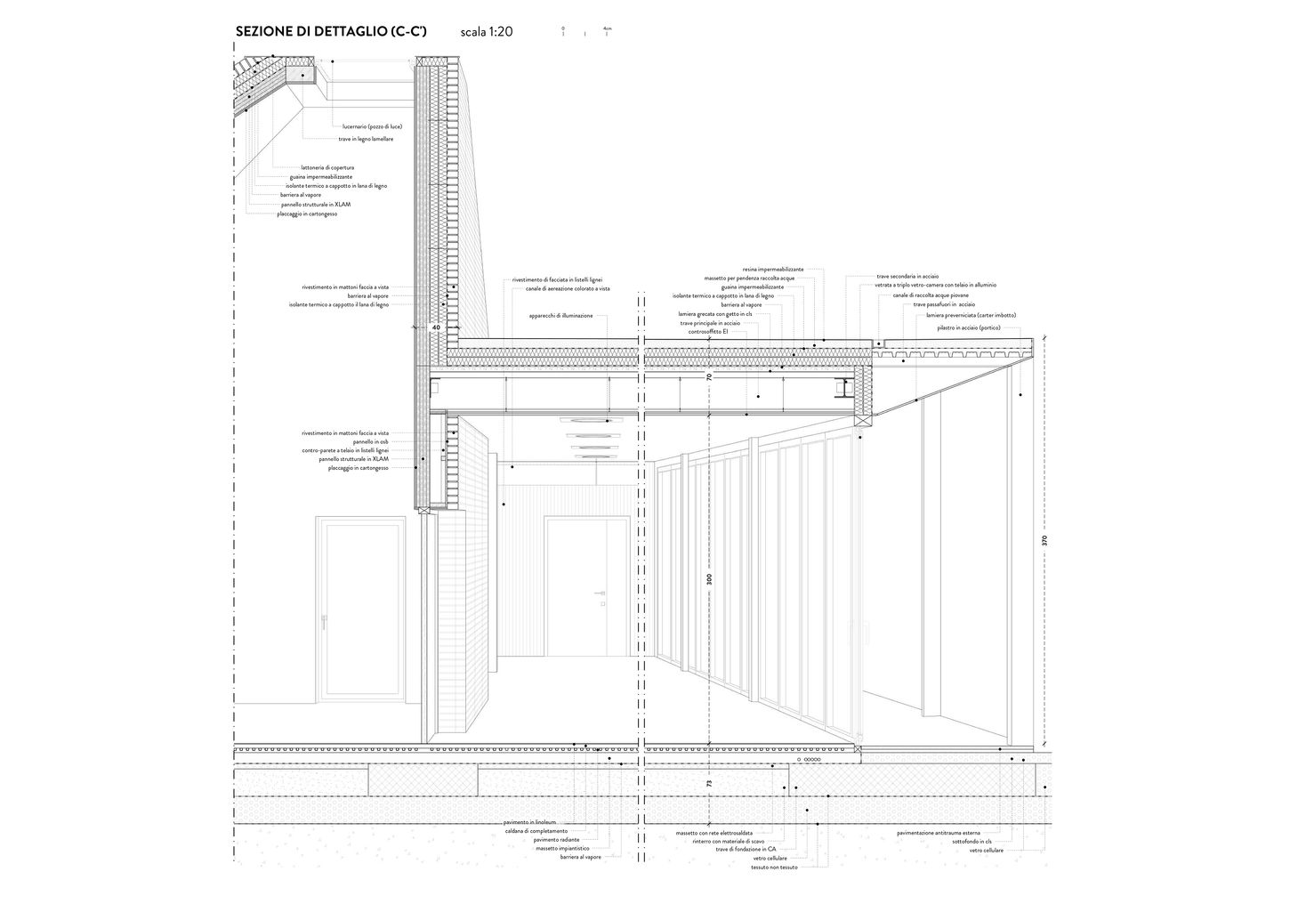 Ogni padiglione è composto da una Pergola porticata che protegge le Casette che la “abitano”. Alcuni volumi “emergono” interrompendo l’orizzontalità della copertura piana e sviluppandosi in altezza come pozzi di luce che illuminano spazi collettivi o come rivisitano i camini tradizionali, ospitando le macchine impiantistiche.