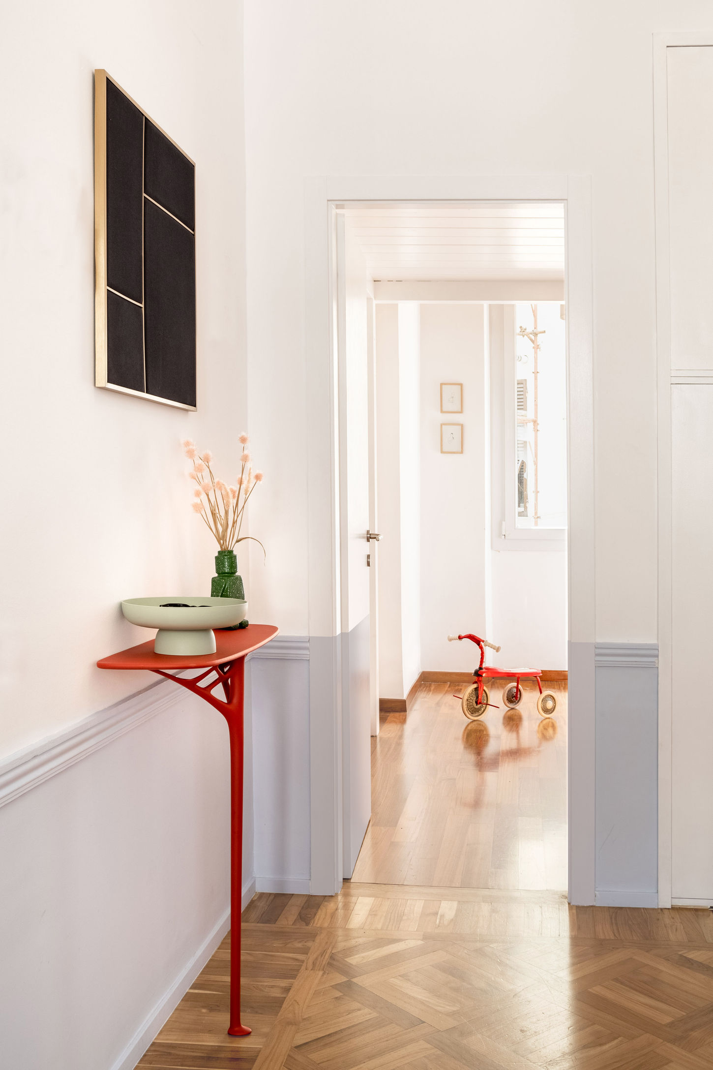 Il soffitto affrescato della sala da pranzo sovrasta un grande tavolo scultoreo. In salotto, un volume rosso tridimensionale funge da parete TV e portale. La luce perimetrale esalta i soffitti decorati, creando un’atmosfera morbida e avvolgente.