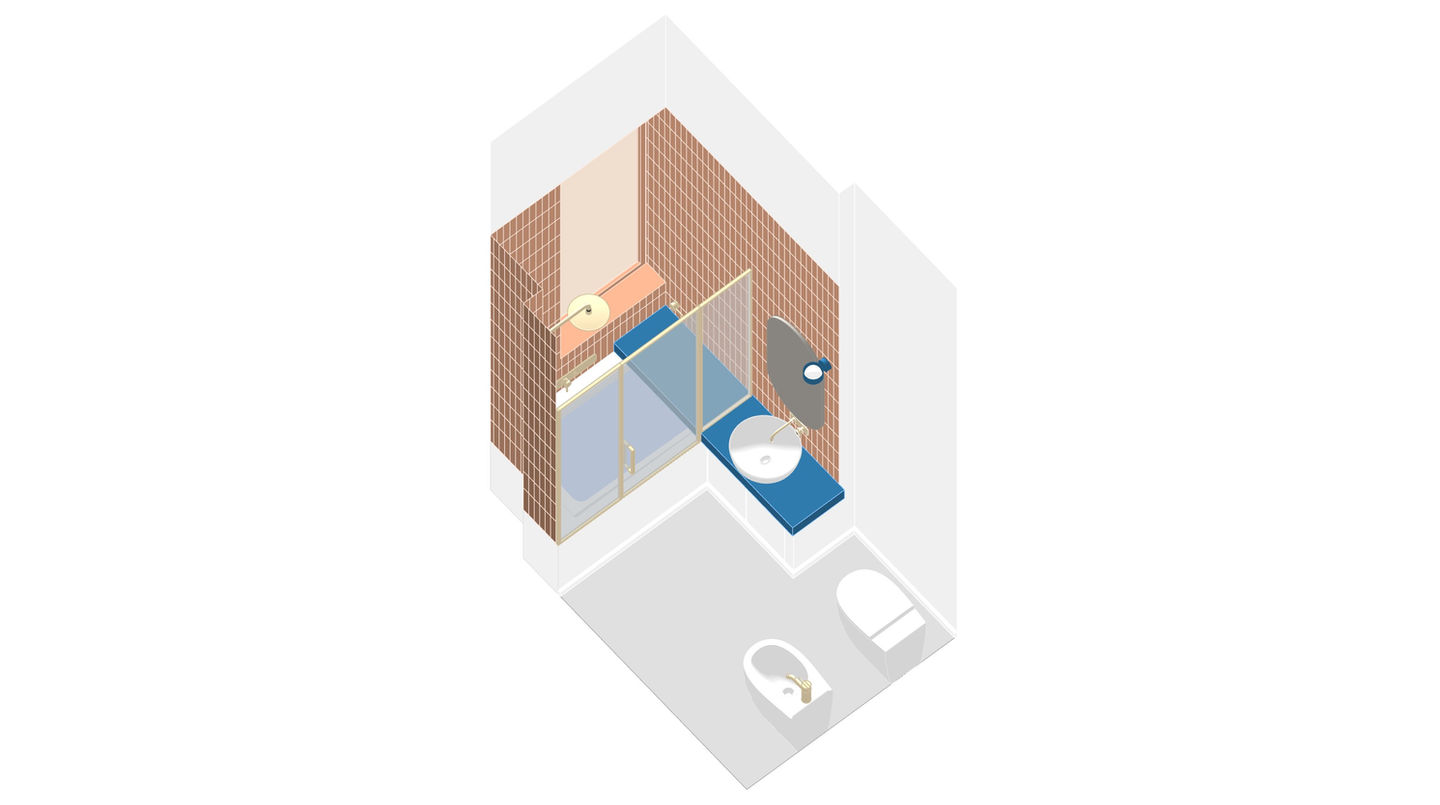La zona notte ospita due camere e due bagni. Nella matrimoniale, una nicchia blu notte accoglie una cabina armadio a doppio livello, accessibile tramite una scaletta corallo dal design tubolare. Le cromie complementari evocano l’universo marino, definendo pieni e vuoti.